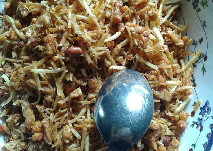 Tempe serta ubi kentang digoreng hingga garing. Siapkan 1 potong besar tempe sekitar 500 gram. 3 ulas bawang putih.